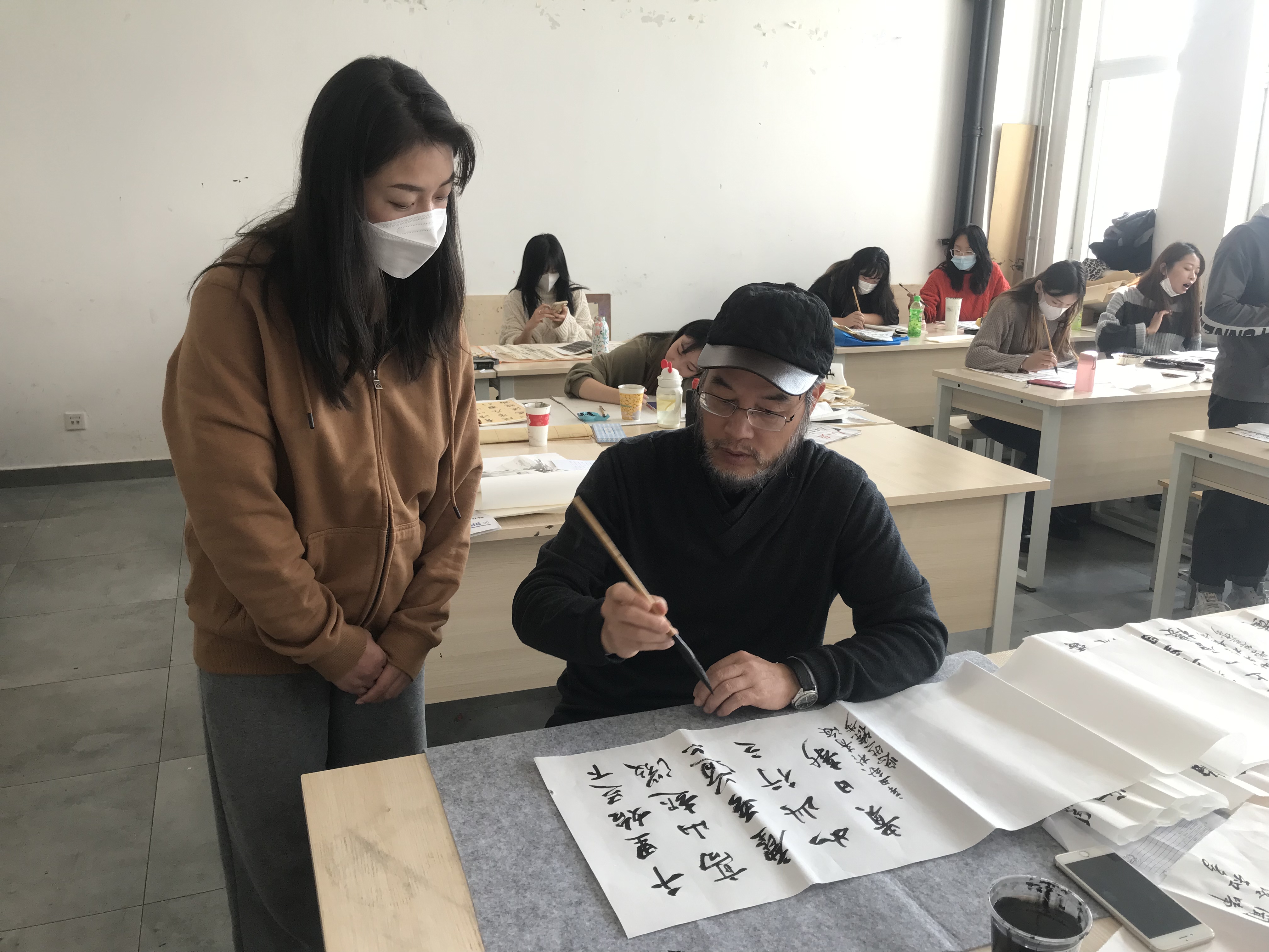 美术课因其特殊性,除了讲解之外,更多的是示范和交流。在青海师大的书法课堂上,徐步以王羲之的《兰亭序》作为行书教学的范本。但一些少数民族学生受自身语言环境的影响,汉语表达和理解并不是很准确,学起来有些吃力。徐步为此下了一番工夫。