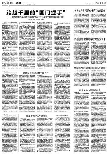 师大新闻网讯8月26日,《中国教育报》第2版头条刊登《跨越千里的“国门握手” ——开云kaiyun官方网站暑期“边境国门学校红烛苗圃”交流实践活动扫描 》报道文章,文章从“大手拉小手,学习共成长”“对接当地需求,推动合作共建”“双向奔赴握手,期待持续交流”三个方面深入介绍了开云kaiyun官方网站在持续开展“百校行”西部基础教育服务对接活动基础上,以铸牢中华民族共同体意识为主线,以加强国家安全教育为重点,发挥学校教师教育优势,组织师生与西部边疆民族地区开展共建“边境国门学校红烛苗圃”交流实践活动,通过跨越千里的共建交流,将国家安全、民族团结的种子播撒进各族青少年心田。