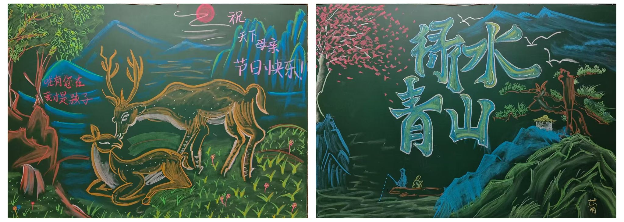 韩苏苗在朋友圈记录下她的一个个得意之作。去年母亲节的板报上,一头母鹿微微俯身,亲昵地爱抚着卧在地上的小鹿,搭配画面上的配文“唯有您在 我才是孩子”,烘托出浓浓的母爱氛围。