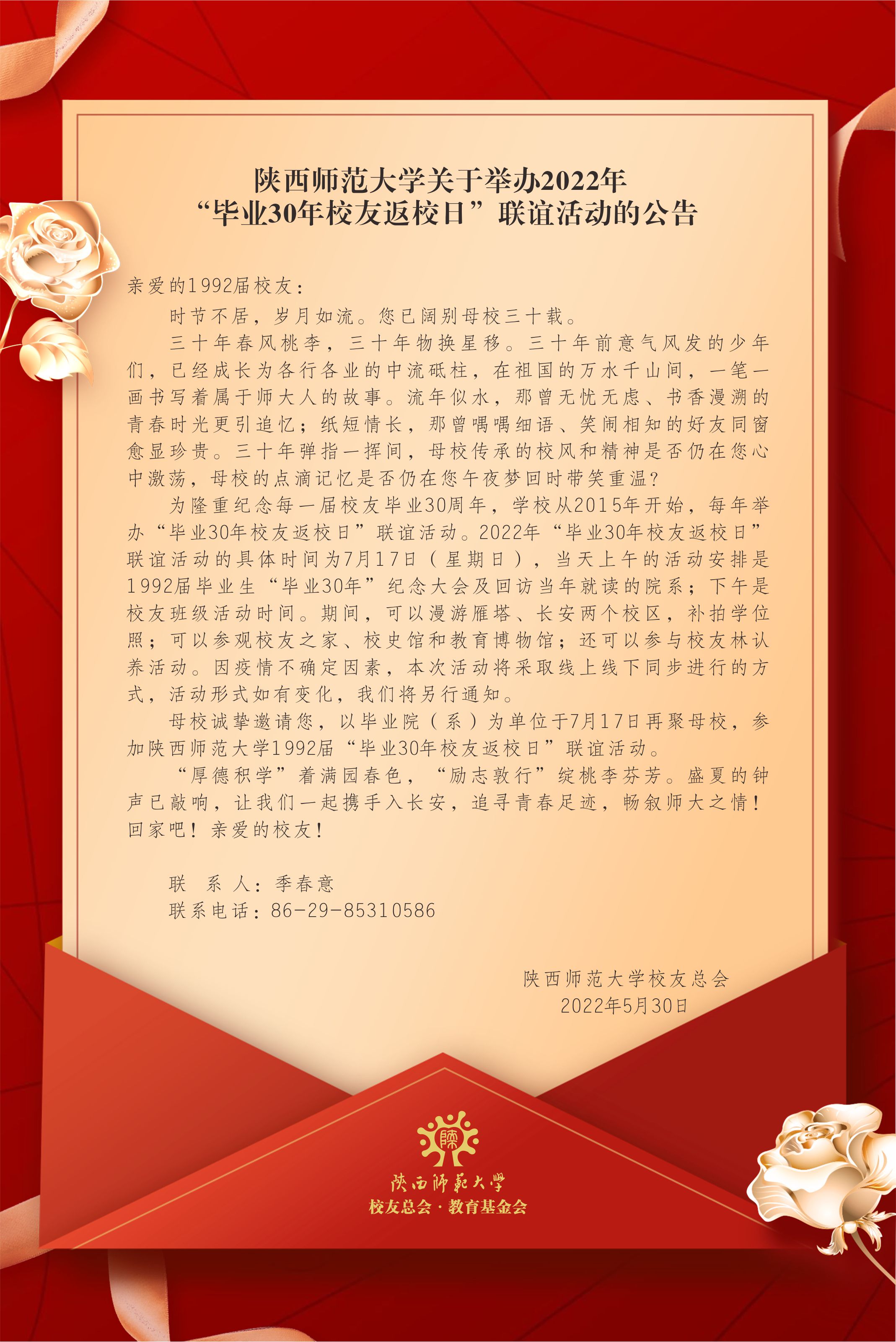 开云kaiyun官方网站关于举办2022年“毕业30年校友返校日”联谊活动的公告