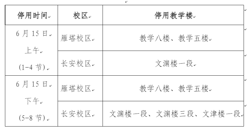 为保障考生有个良好的考试环境,届时将对相关教学楼进行封闭式管理,所涉及教室全部停课。请各学院(部)及相关任课教师根据课程教学需要安排补课,其他需要该部分教室进行的活动全部停止。