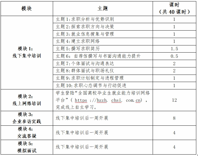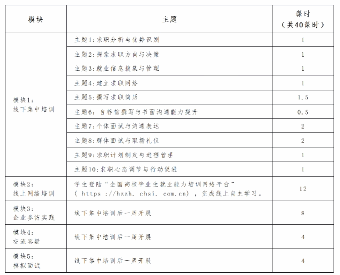 培训课程紧密围绕大学生职业生涯发展和就业现实问题,以促进就业意识、转变就业态度、推动就业行动、提升就业能力为课程目标,包含5个模块,注重引导学生在互动中探索职业方向、提升就业能力。
