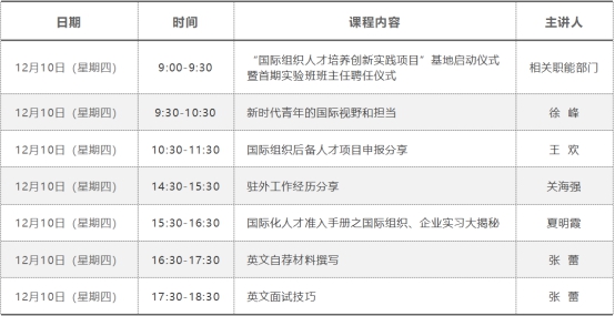 “国际人才求职精准指导训练营”旨在帮助毕业生了解国际形势与规则,开拓国际视野,提升语言、管理、国际谈判等方面的技能,培养一批有中国情怀、懂政策、知国情、会管理、精业务、宽视野、善沟通的国际人才到国际组织及境外企业实习、任职。