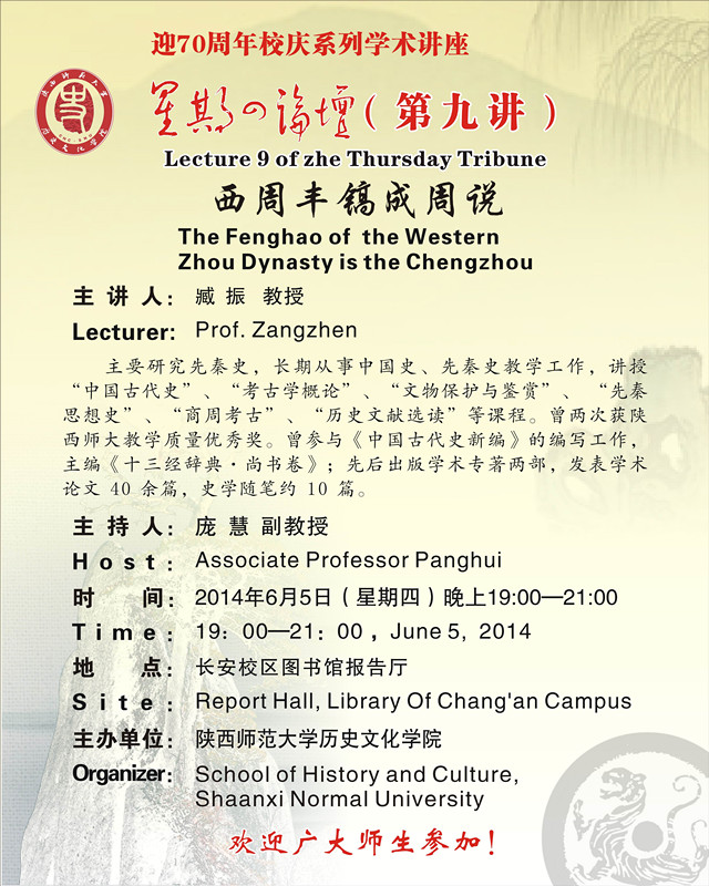 讲座题目:迎70周年校庆系列学术讲座之星期四论坛第九讲:西周丰镐成周说