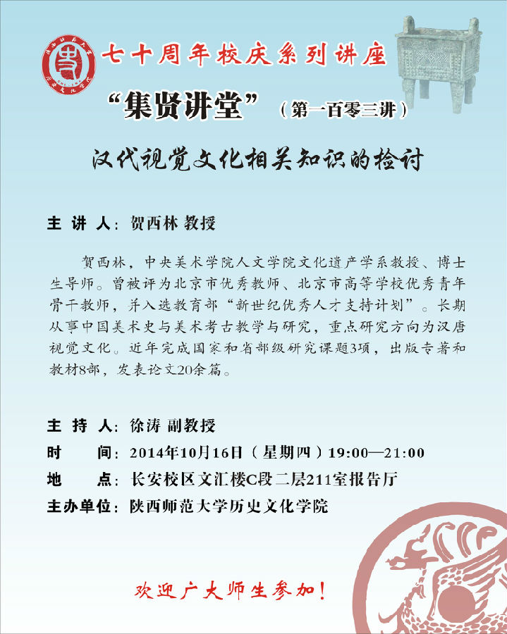 讲座题目:历史文化学院迎70周年校庆系列学术讲座之集贤讲堂103讲:汉代视觉文化相关知识的检讨