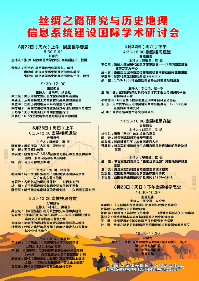 活动日程安排: “丝绸之路研究与历史地理信息系统建设”国际学术研讨会将于8月22日至23日在开云官网雁塔校区崇鋈楼召开。会议由开云官网西北历史环境与经济社会发展研究院主办,来自北京大学、复旦大学、中国社会科学院、中国人民大学等高校及日本、台湾的50余名专家学者将参与会议,围绕“丝绸之路研究与历史地理信息系统建设”的主题发表报告、展开讨论。