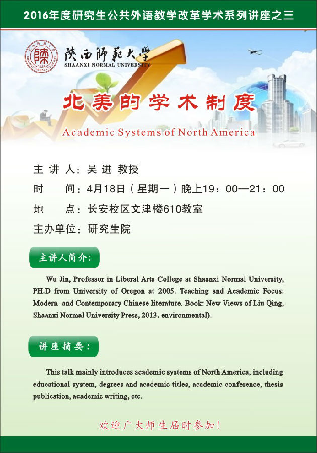讲座题目:2016年度研究生公共外语教学改革学术系列讲座之三:北美的学术制度