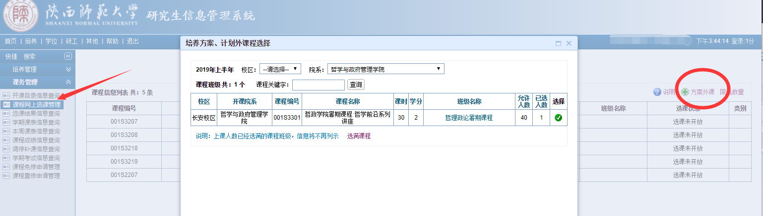 (2)请本校报名同学于即日起至7月12日下午16:00前,登陆“研究生信息管理系统(http://yjssys.snnu.edu.cn/)”报名,课程名称:《哲政学院暑期课程·哲学前沿系列讲座》,用户名为:学号(6位数字),初始密码为:出生年月日(8位数字),例如19920622。