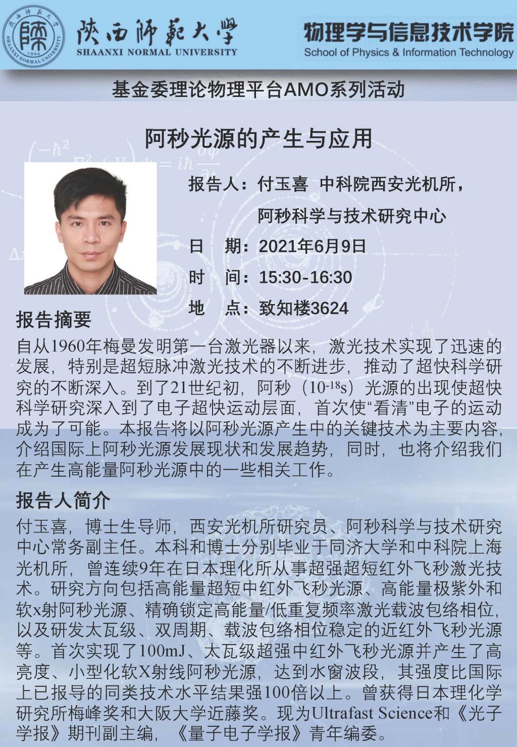 报告人:付玉喜 研究员(中科院西安光机所,阿秒科学与技术研究中心)