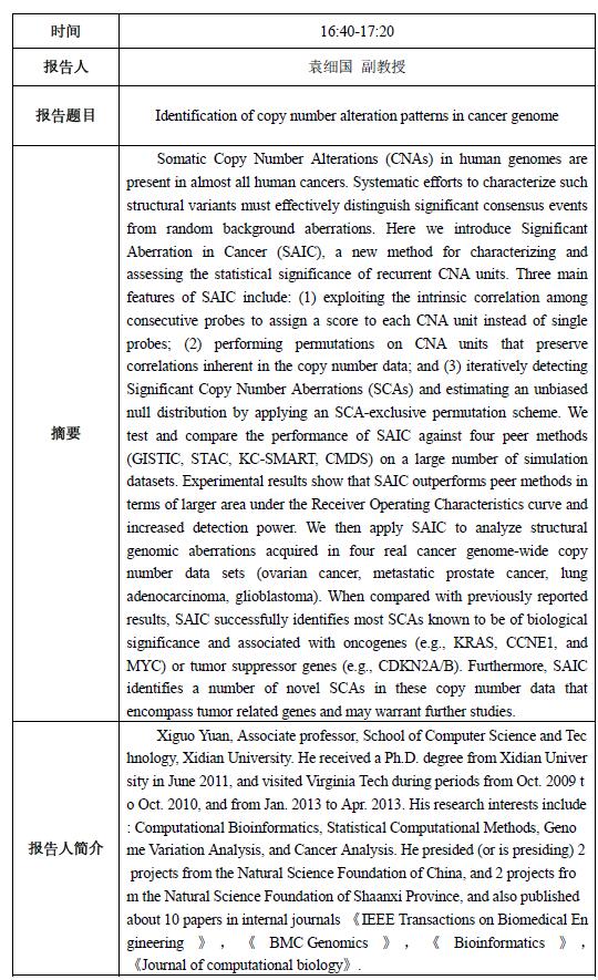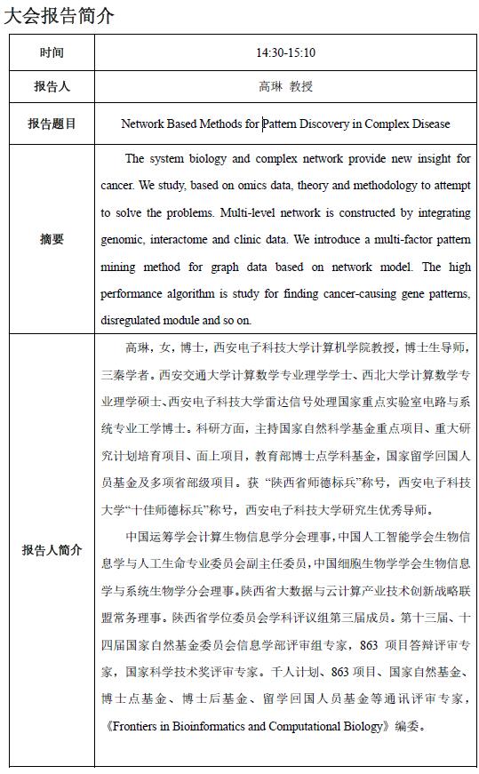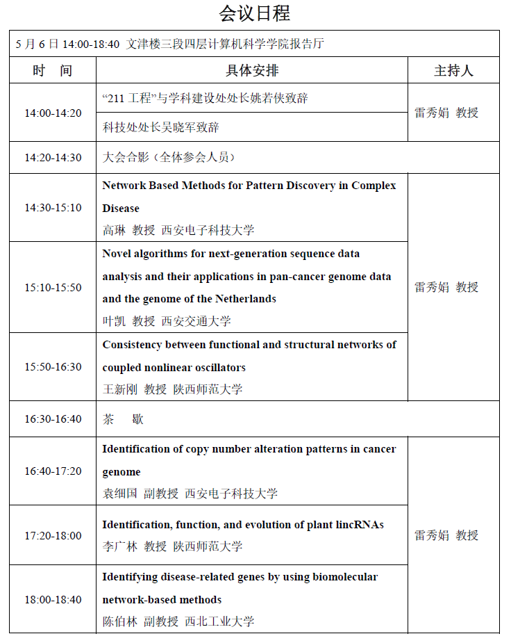 活动日程安排:信息技术与生命科学深度融合,生物信息交叉学科的研究已成为重要的国际前沿,必将促进信息、生命、数学、物理、控制等相关学科的交叉与发展。为推进开云官网一流学科建设、推动生物大数据计算科研团队发展、激励学术创新,拓展学术视野,加快新型交叉学科培育,学院将于5月6日举办2016年度生物信息计算交叉学科论坛。会议针对计算生物信息学领域的前沿研究邀请高琳教授(西安电子科技大学)、叶凯教授(西安交通大学)、袁细国副教授(西安电子科技大学)、陈伯林副教授(西北工业大学)、王新刚教授(开云kaiyun官方网站物理学与信息技术学院)和李广林教授(开云kaiyun官方网站生命科学学院)共6位专家对相关领域的最新研究进展和动向做专题报告,共同交流生物信息计算交叉学科研究领域中的理论、方法和应用创新,探讨信息技术与生物、医学等结合所面临的新问题、新机遇以及未来发展方向。欢迎各位师生前往!