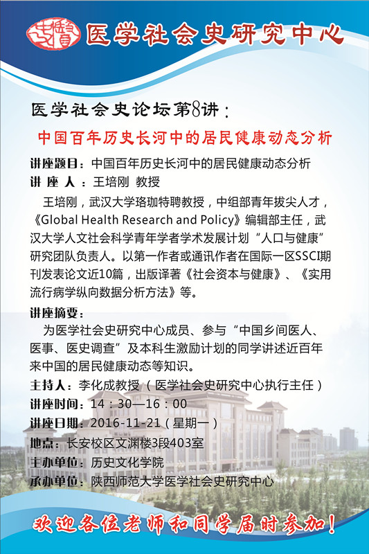 讲座题目:医学社会史论坛第8讲: 中国百年历史长河中的居民健康动态分析