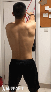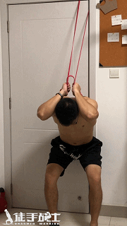 这个练习就很经典了,模拟屈臂撑的发力。弹力带有个好处是,做起来不会对手腕有很大的压力,当然也要看你怎么抓。总之,弹力带在最低点的时候,要让肩部往下沉,发挥胸小肌的力量,将动作固定的更好:
