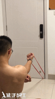 这个练习有点像健身房的绳索下压,你也可以做绳索下压那个往下的发力方式。但是在利用门框这个操作上面,微屈膝盖,臀部抵住门(建立稳定性),上半身适度前倾,去做这个练习会更加舒适。记住有个小细节,最远端的时候,小臂要有一个往外的旋转,这样可以增强三头的长头: