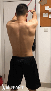 后面几根手指勾住弹力带,然后拉向耳朵后方,大拇指朝后(目的是为了外旋肩关节,让后束募集更多)。大家仔细观察我和弹力带相处的方式——我没有按照弹力带原本的长度来抓,而是抓住更远端,给自己制造一个更舒适的发力: