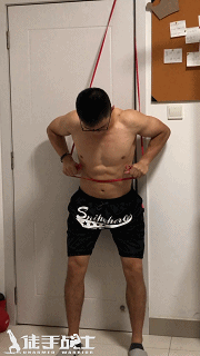 弹力带,用于辅助一些徒手的练习,让动作更容易上手。但是,对抗弹力带本身,也是可以完成很多有趣的训练的。首先,准备一根弹力带,然后,把它套住门的上角,把门关上。