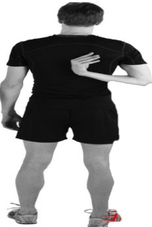 (2)单手触摸肩胛骨,将一只手置于背后,保持肩部的放松和下垂,尽量让这只手触到同一侧的肩胛骨,保持腰部挺直,换另一支手重复上述动作。(通常一只手比另一支手做起来容易一些)。