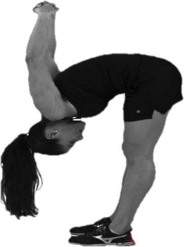(7)双手背后相扣前屈体,双脚并拢站立,双臂置于背后,双手手指相扣,双臂自然下垂(双手靠近尾骨),直腿向前屈体,使额头尽量靠近膝盖,双臂自然抬高。