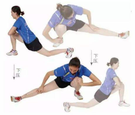(6)弓步压腿,以右前弓步为例,双手叉腰,右脚向前迈一大步,右腿屈膝,脚尖稍向内;左腿膝盖伸直,脚尖向前,两脚全脚掌着地,身体正对前方,髋部向下压,腰部绷紧,重心在两腿之间。腿做有节奏的弹动动作,并带动髋部前送,牵拉左小腿腓肠肌及髋部肌肉。