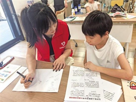 八月十五日,在西安市新城区尚朴社区老年服务中心,西安市小火柴志愿者服务中心志愿者在辅导孩子完成暑假作业。