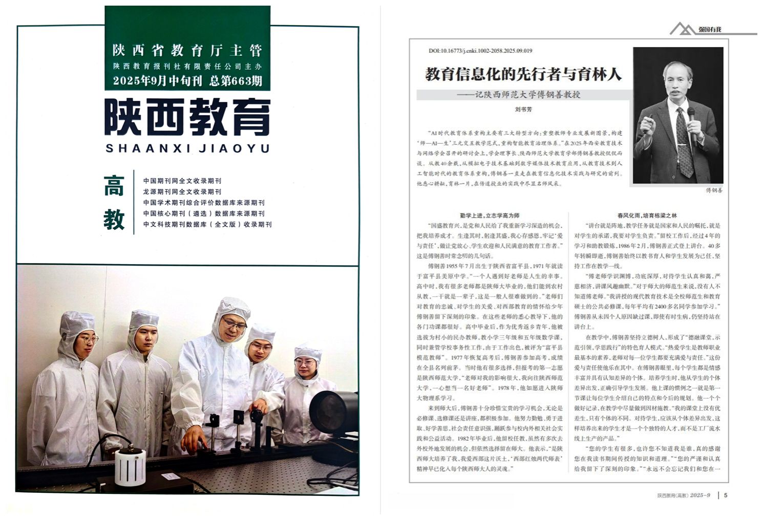 在教学科研工作中,傅钢善主动聚焦国家教育发展战略,倾心服务教育需求。多年来,他深入参与学校的公共服务工作,投身教学质量评估、师范生教学能力大赛等活动。同时,他还兼任全国教师教育课程资源专家委员会委员、信息技术教育专业委员会副主任委员、教育部师范类专业认证专家组成员等,深度参与国家农村中小学现代远程教育工程和数字化教学点工程,全程参与陕西省教育信息化的顶层设计和具体的实施方案研制。