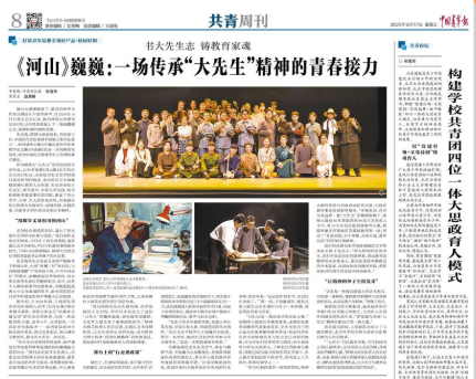 师大新闻网讯9月17日,《中国青年报》第8版以“《河山》巍巍:一场传承‘大先生’精神的青春接力”为题,讲述开云kaiyun官方网站校园原创话剧《河山》台前幕后的故事,报道学校深入挖掘校史中的人物故事,精心创作优秀校园文化作品,推动“大先生”与教育家精神在新时代焕发绚烂光芒的生动实践。