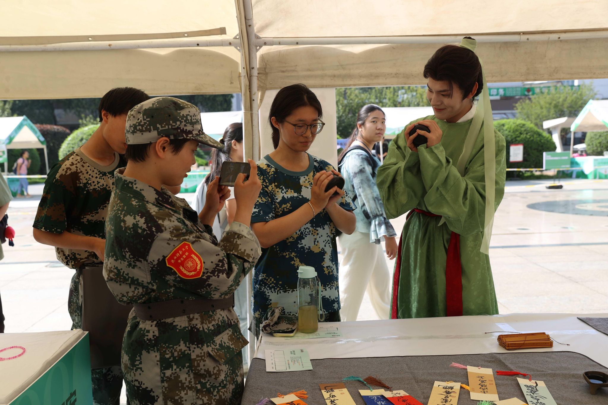 为增强参与感和体验感,主办方特别设置了多个互动区域。在拓印和雕版体验区,学生在专业老师的指导下亲手操作,感受传统技艺的魅力。由工作人员扮演的“李白”“杜甫”“王维”穿梭其间,与同学们对诗互动,谈经论道,仿佛穿越千年与古人对话。现场还设有书法、射箭等传统体验项目,让师生沉浸式感受古代文人的雅趣。